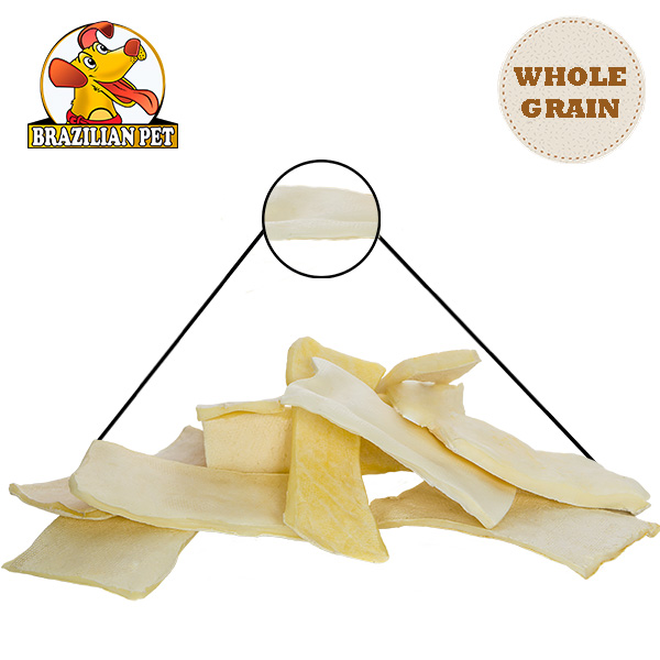Brazilian Pet rawhide Chips are made of Whole Grain Rawhide. Traditional rawhides include only the inner layer. This product is made of a full grain material including the outer layer of the hide, known for it’s high resistance. This layer gives our rawhide the following properties: